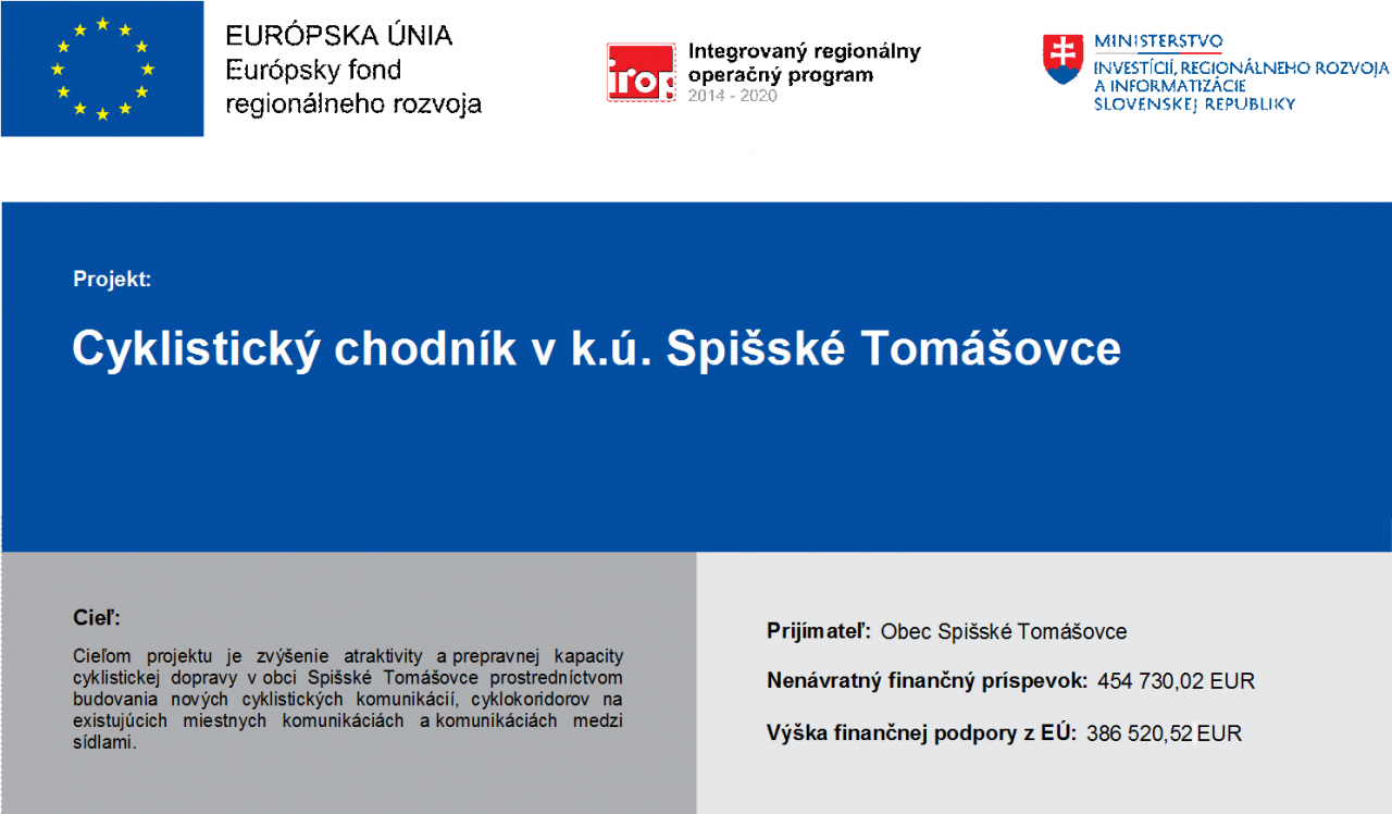 Hlavným cieľom projektu je zvýšenie atraktivity a prepravnej kapacity cyklo dopravy v obci Spišské Tomášovce, prostredníctvom budovania nových cyklistických komunikácií.