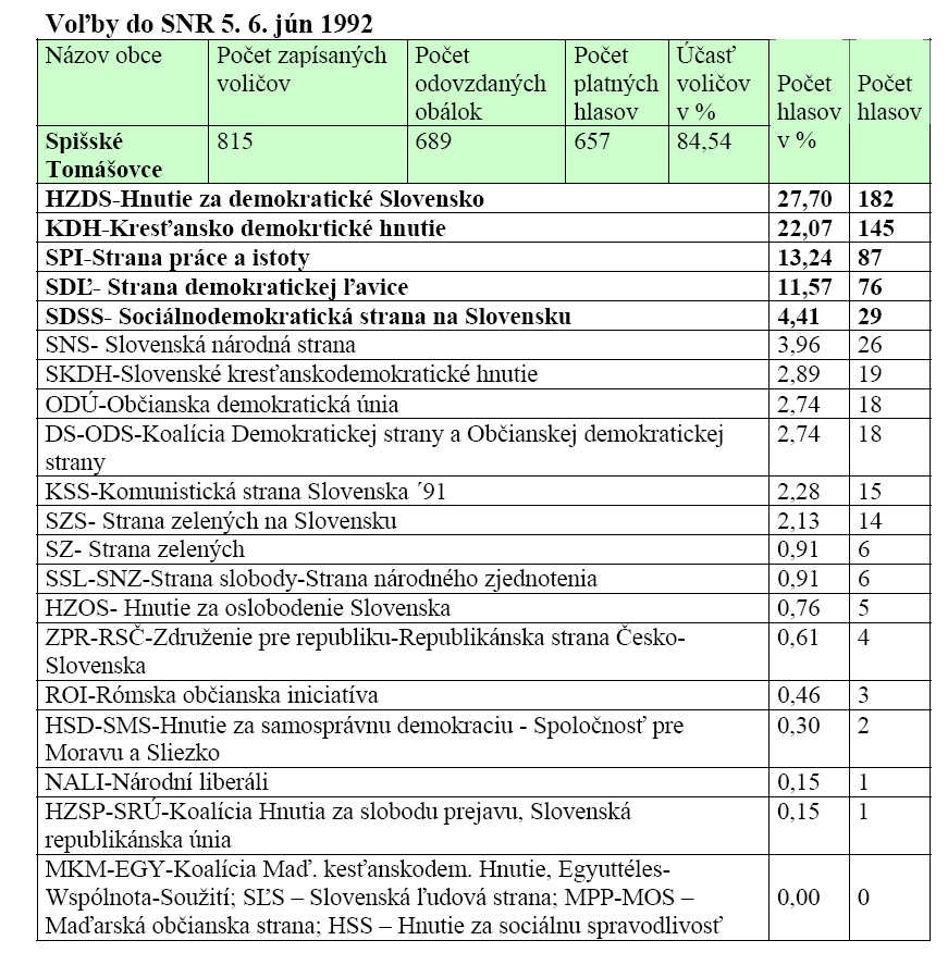 Ďalšie voľby do SNR sa konali 5. a 6. júna 1992. V obci Spišské Tomášovce zvíťazilo HZDS (27,7%), druhé bolo KDH (22,07 %).