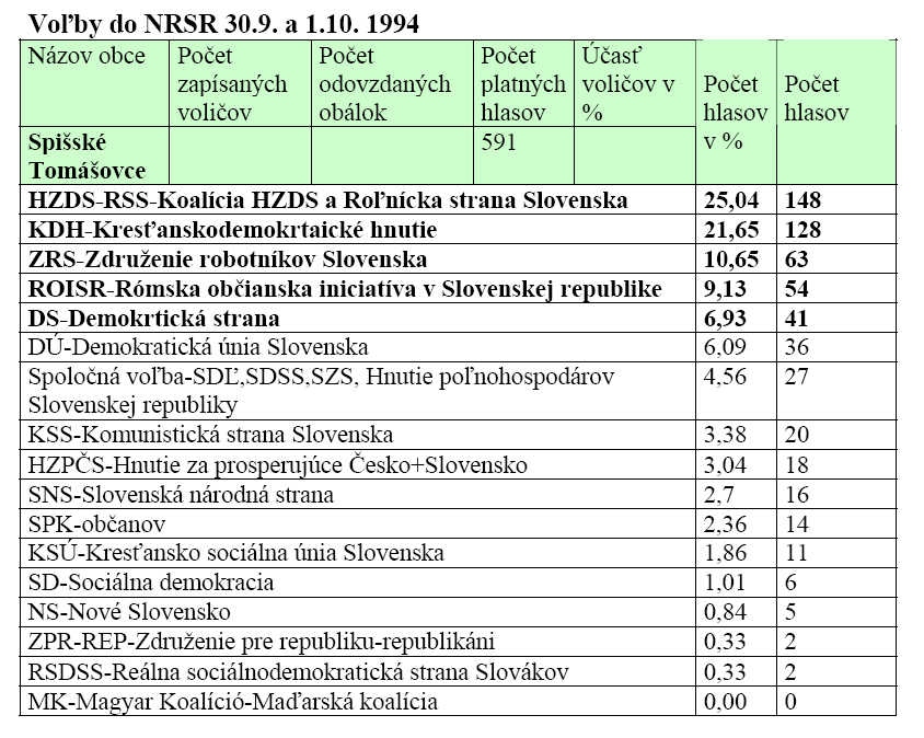 samostatnej Slovenskej republiky (1.1.1993) prišlo aj k zmene názvu najvyššieho zákonodarného orgánu. Slovenská národná rada (SNR) sa premenovala na Národnú radu Slovenskej republiky (NR SR) a voľby do tohto orgánu sa konali prvý krát 30. 9 a 1. 10. 1994. V našej obci opäť vyhralo HZDS, ktoré získalo 25,04 % hlasov. Druhé miesto a 21,65 % hlasov získalo KDH. Združenie robotníkov Slovenska so ziskom 10,65 % hlasov obsadilo tretie miesto. Víťazom volieb na Slovensku sa stalo rovnako HZDS so ziskom 34,9 % hlasov.