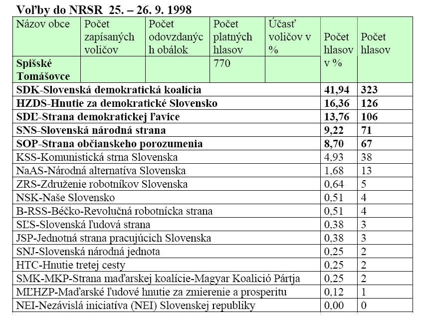 Prvé miesto vo voľbách, ktoré sa konali 25. a 26. septembra 1998, si už HZDS v obci Spišské Tomášovce neobhájilo. V obci získala prvé miesto koalícia SDK 41,94 %, druhé HZDS malo 16,36 % hlasov. Treťou stranou v poradí na Slovensku aj v našej obci bola SDĽ.