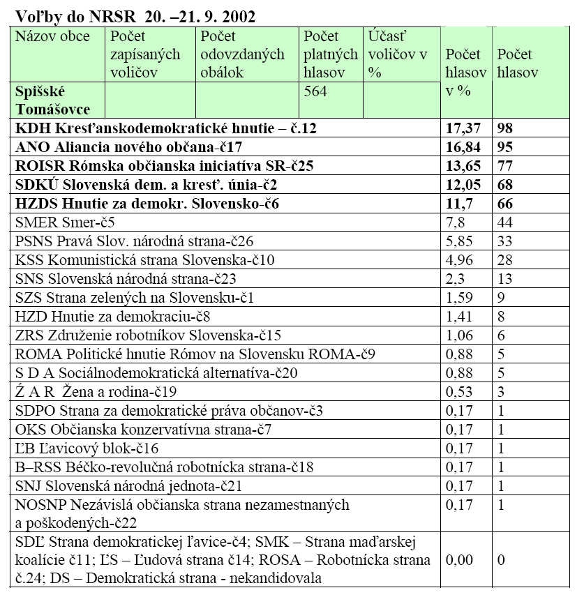 Zmenu na prvom mieste v rámci výsledkov za obec Spišské Tomášovce priniesli aj voľby, ktoré sa konali 20. a 21. septembra 2002. V obci vyhralo KDH (17,37 %), druhá bola ANO (16,84 %). Tretie miesto patrilo ROISR – Rómska občianska iniciatíva (13,65 %), štvrté miesto obsadilo SDKÚ (12,05 %) a piate HZDS (11,7 %). Na šiestom mieste skončil SMER (7,8 %).