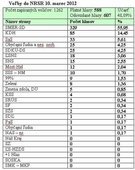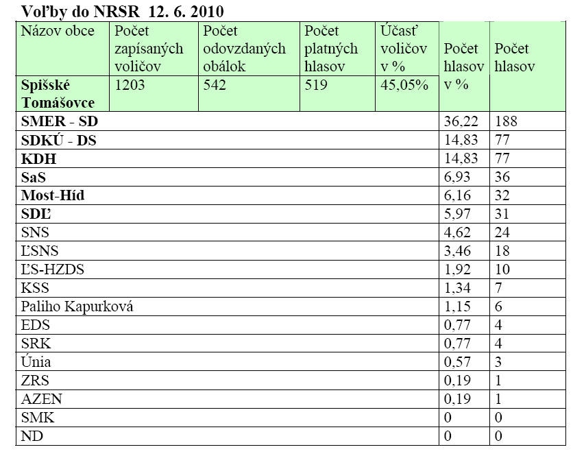 Tak ako v roku 2006 aj v roku 2010 vyhral v našej obci SMER, na druhom mieste bola SDKÚ-DS, ktorá mala rovnaký počet hlasov ako vo voľbách 2006 (teda 77). V rámci celého Slovenska na treťom mieste bola SaS, ktorá v našej obci skončila na štvrtom mieste, pretože tretie bolo KDH.