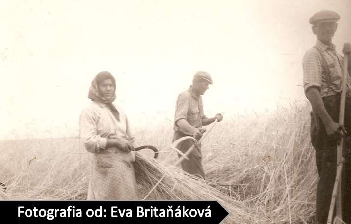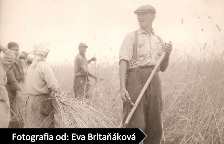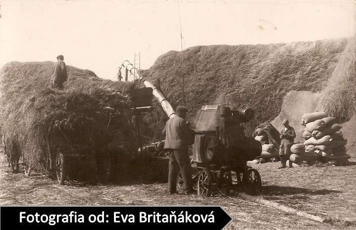 Mláťačka obilia, obsluhuje ju Jozef Britaňák